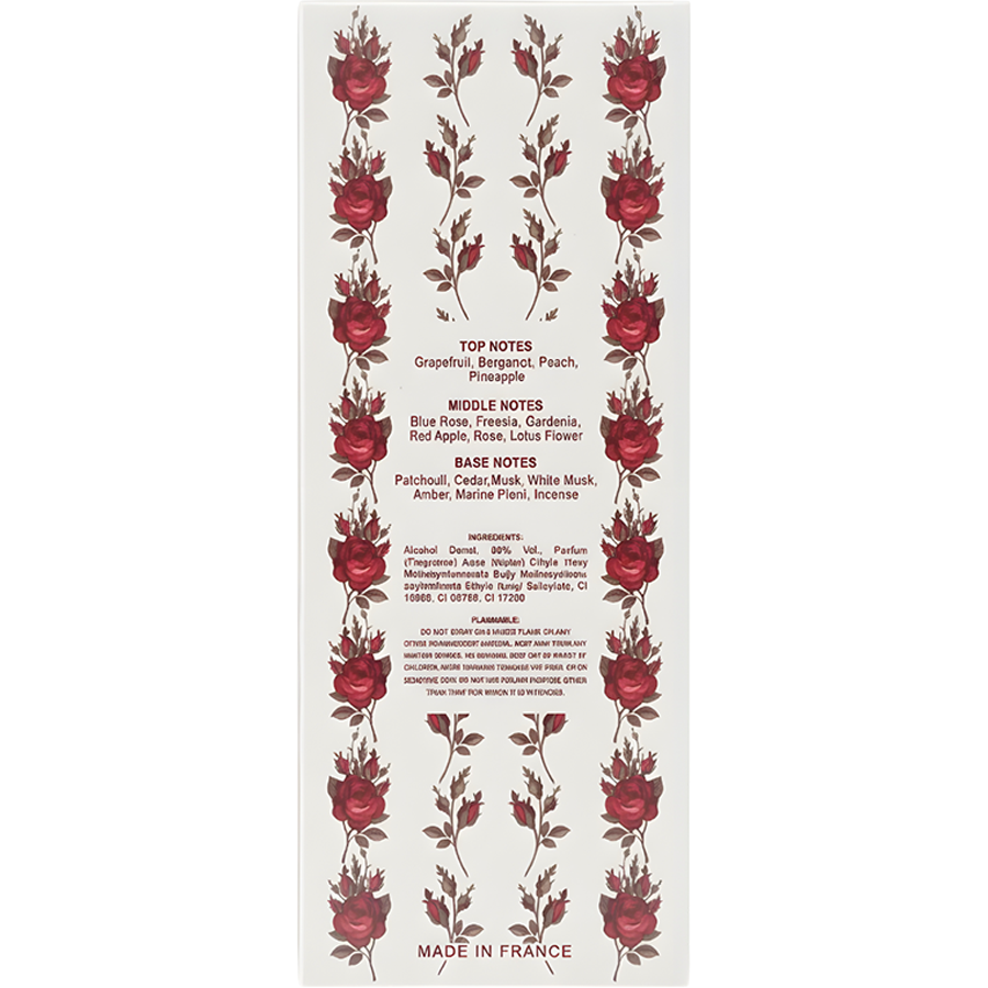 * نتهای میانی (Middle Notes): قلب عطر مملو از هارمونی گلی است، شامل رز آبی (Blue Rose)، فریزیا (Freesia)، گاردنیا (Gardenia)، سیب قرمز (Red Apple)، گل رز (Rose) و گل نیلوفر آبی (Lotus Flower). این بخش، لطافت و اصالت زنانهٔ عطر را به نمایش میگذارد.