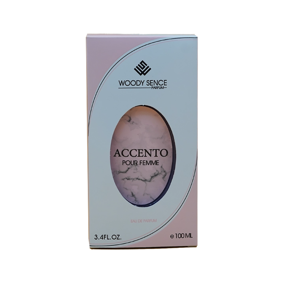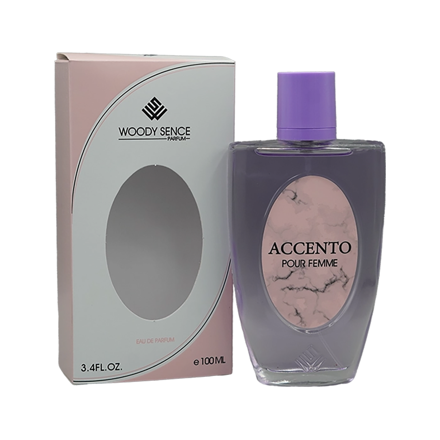 ادکلن وودی سنس مدل اکسنتو با حجم ۱۰۰ میلی‌لیتر، عطری با رایحه میوه‌ای، گلی و تازه است که از نسخه اصلی Xerjoff Accento الهام گرفته شده است. نت‌های اصلی این عطر شامل آناناس، سنبل، گل یاس و زنبق است که با پایه‌ای از مشک و کهربا تکمیل می‌شود. این محصول به دلیل شباهت رایحه به نسخه اصلی و قیمت اقتصادی، در میان عطرهای شرکتی طرفداران زیادی دارد و برای استفاده در فصول بهار و تابستان بسیار مناسب است.